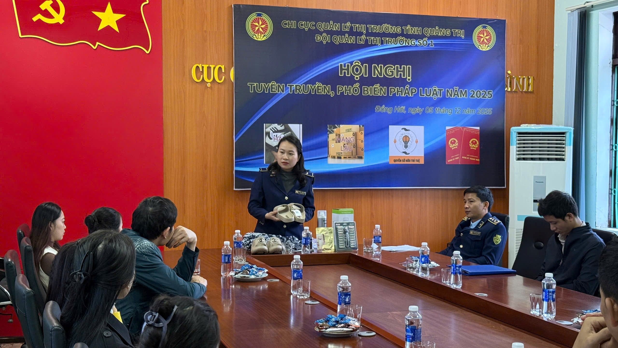 Thực hiện Kế hoạch truyền thông, tuyên truyền phổ biến pháp luật năm 2025 của Chi cục Quản lý thị trường tỉnh Quảng Trị được ban hành kèm theo Quyết định số 286/QĐ-CCQLTT ngày 07/10/2025 của Chi cục trưởng Chi Cục Quản lý thị trường tỉnh Quảng Trị, chiều ngày 05/12/2025, Đội Quản lý thị trường số 1 đã phối hợp với Phòng Văn hóa – Xã hội thuộc UBND phường Đồng Hới tổ chức Hội nghị tuyên truyền, phổ biến pháp luật năm 2025 đến các tổ chức, cá nhân kinh doanh trên địa bàn phường Đồng Hới.