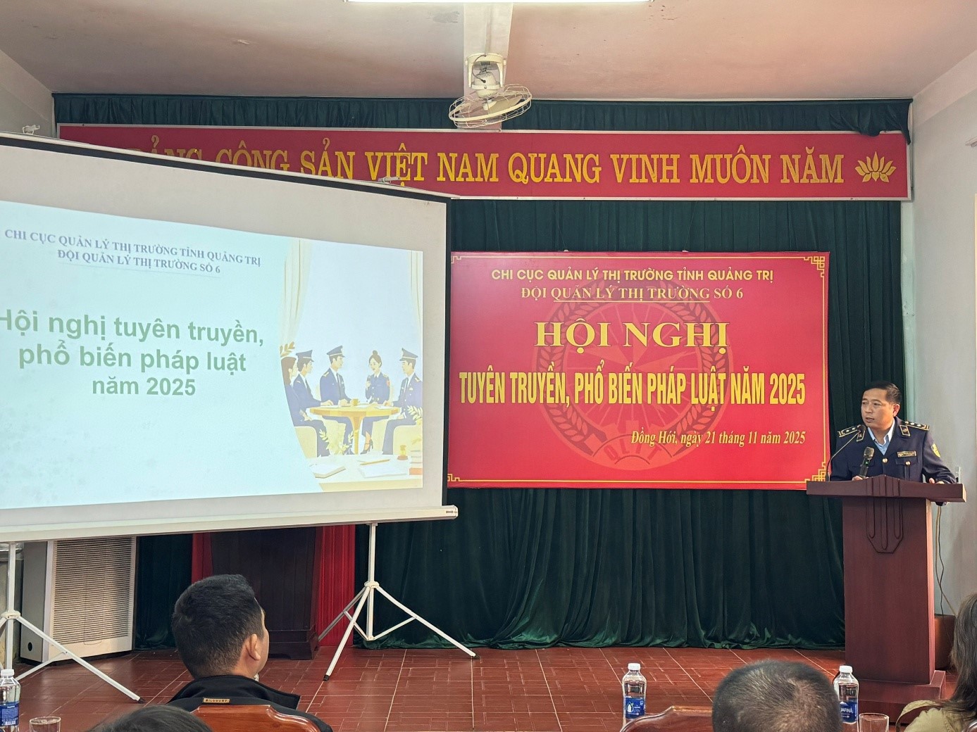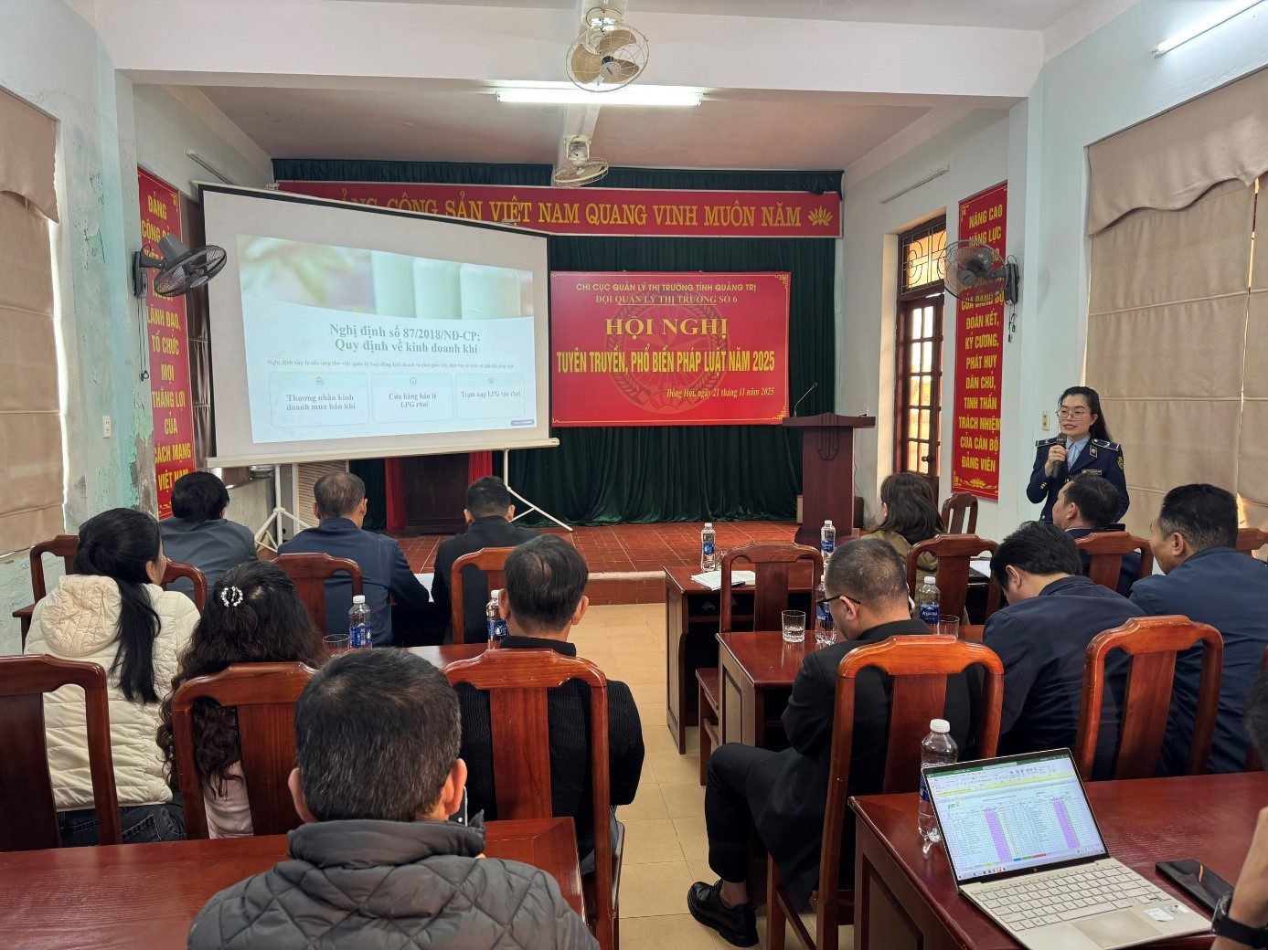 Ngày 21/11, Đội Quản lý thị trường số 6 tổ chức Hội nghị tuyên truyền, phổ biến các quy định của pháp luật về kinh doanh khí dầu mỏ hóa lỏng trên địa bàn tỉnh. Dự hội nghị có lãnh đạo, công chức Đội Quản lý thị trường số 6 và các tổ chức, cá nhân kinh doanh khí dầu mỏ hóa lỏng trên địa bàn tỉnh Quảng Trị.